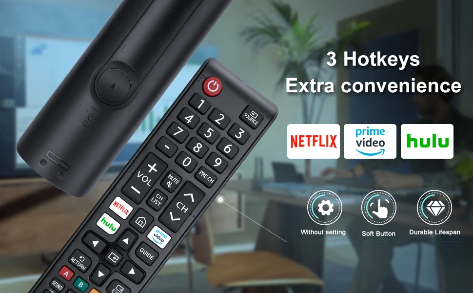 【Key Features】The universal infrared TV remote features 3 shortcut buttons for Netflix, Prime video and Hulu for extra convenience. It is perfect to replace your old or damaged Samsung TV Remote with the remote.