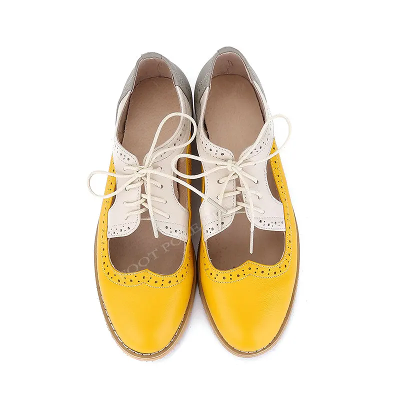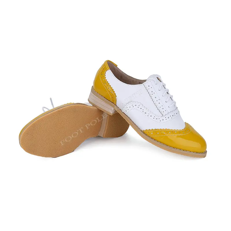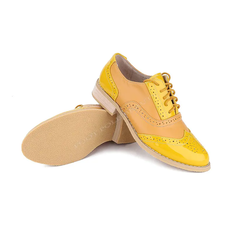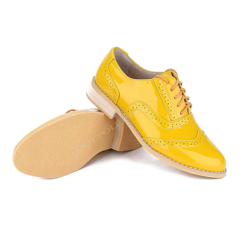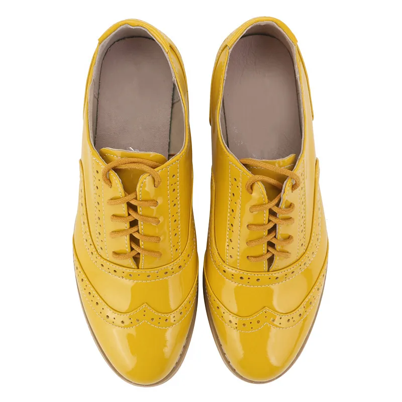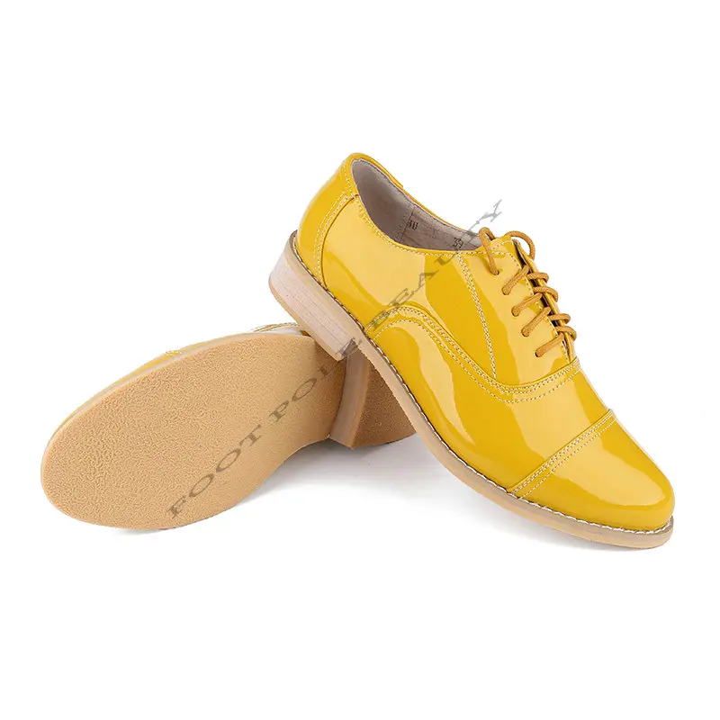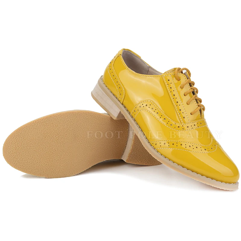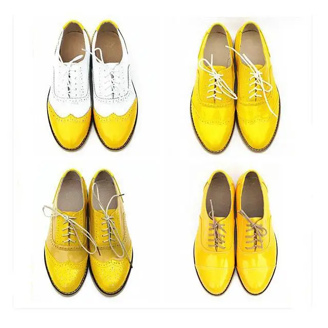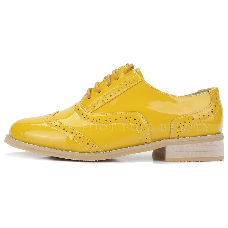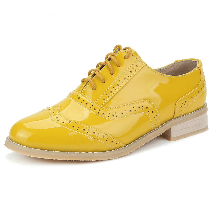 Brand Handmade Genuine Leather Shoes Female Yellow Patent Leather Flat Shoes Plus Size Woman Oxford Shoes Brogues Oxford Zapatos